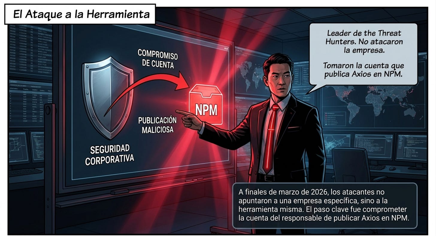 El 31 de marzo de 2026 se identificó un ataque de cadena de suministro contra Axios, una de las librerías HTTP más utilizadas en el ecosistema JavaScript, distribuida a través del registro npm y con una cantidad de descargas semanales de entre70 a 100 millones. El atacante comprometió la cuenta npm del mantenedor principal y publicó dos versiones maliciosas (axios@1.14.1 y axios@0.30.4) que incorporaban una dependencia fantasma (plain-crypto-js@4.2.1) usada exclusivamente para desplegar un troyano de acceso remoto (RAT) multiplataforma en Windows, macOS y Linux.