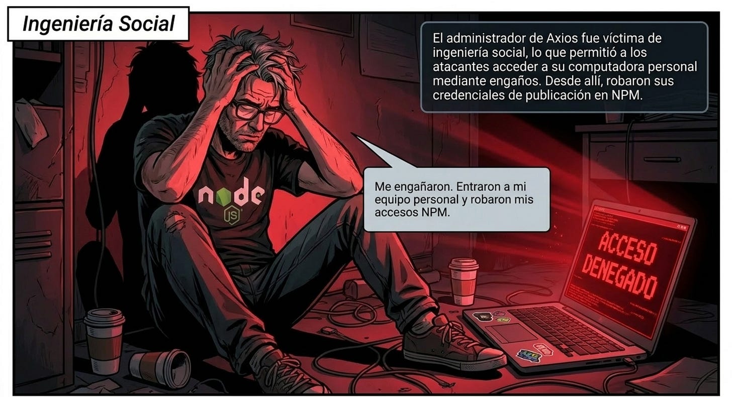 El ataque comienza con la toma de control de la cuenta npm del mantenedor principal de Axios (jasonsaayman). El propio mantenedor, en el post‑mortem del repositorio oficial, indica que el atacante obtuvo acceso a su PC mediante una campaña de ingeniería social y malware RAT, que proporcionó las credenciales necesarias para publicar paquetes en npm.