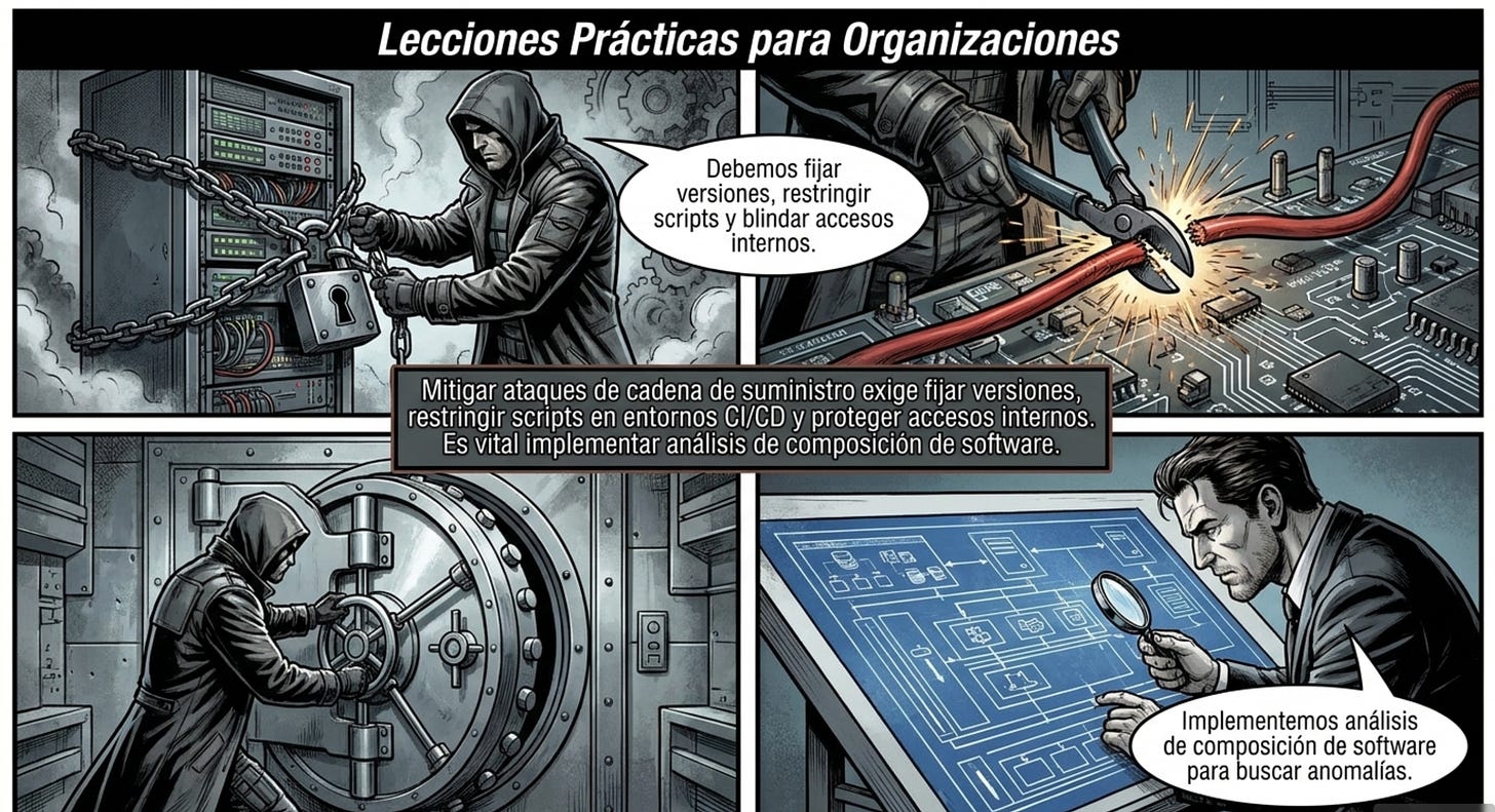 postinstall,preinstall, etc.) de dependencias directas y transitivas, especialmente cuando aparecen paquetes nuevos en el árbol.Aplicar herramientas de seguridad de cadena de suministro (SCA, firmas de artefactos, verificación de procedencia tipo SLSA) para validar integridad y origen.