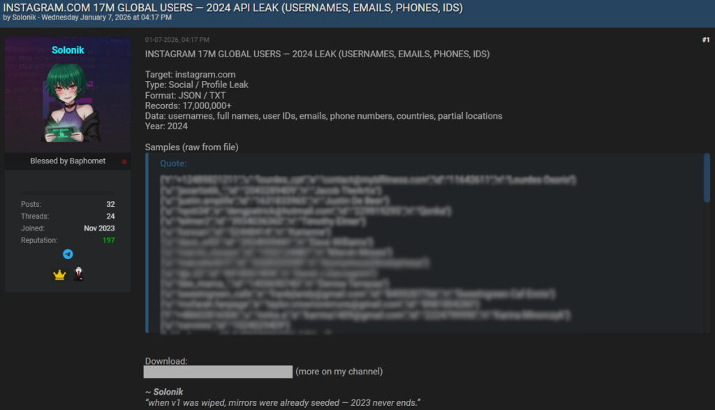 En las profundidades de la dark web, donde los datos valen más que el oro, surgió “Solonik”, un fantasma digital que el 7 de enero de 2026 sacudió al mundo con una bomba: 17.5 millones de perfiles de Instagram expuestos gratuitamente en BreachForums. No fue un hackeo espectacular con exploits zero-day, sino un scraping sigiloso de APIs de Instagram desde finales de 2024, explotando puertas traseras olvidadas en el sistema de Meta. Imagina miles de bots consultando endpoints públicos sin freno, recolectando nombres, emails, teléfonos y direcciones como hormigas en un picnic.